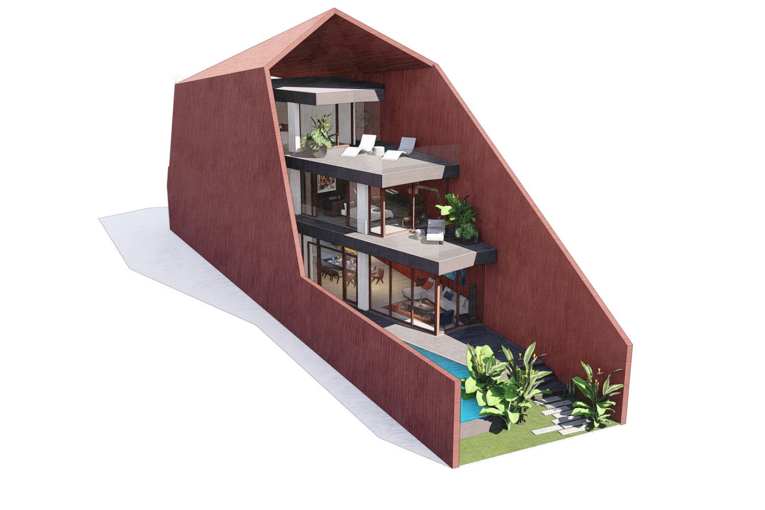 With the task of designing a resort villa with unique functions that the homeowner does not use often. The plan for envisioning the project does not seem to be entirely born from this place. It’s like a tourist joining the custom. Although the house is friendly to its surroundings, it still maintains its own lifestyle. Inspired by the Burrito roll, this villa plan emphasizes individuality, privacy, independence and discreetness. Although friendly and liberal, it does not blend in with its surroundings. The building needs to adapt its form and respect the whole. However, it still requires a breakthrough in expressive language.
