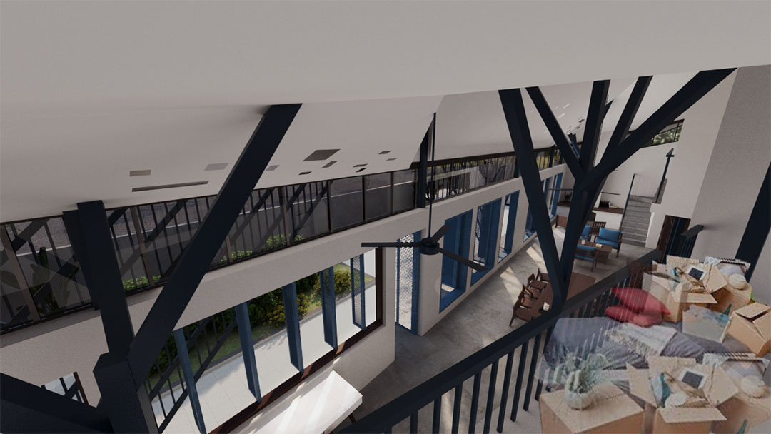 Regarding the architectural design for the house, we use a two-layer, sloping roof. The upper layer is insulated with corrugated iron, reducing noise in the rain and absorbing most of the solar radiation.