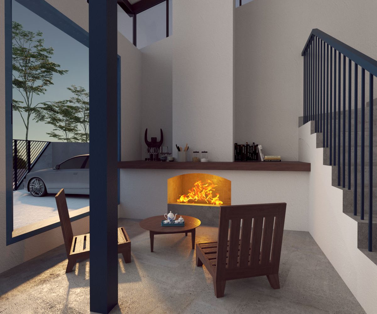 Architectural designs and materials respond to future site changes. The roof is designed so that when the yard is cut, it still ensures functionality and aesthetics. The fireplace area can be easily converted into a modern open kitchen space.