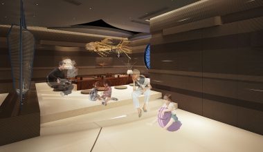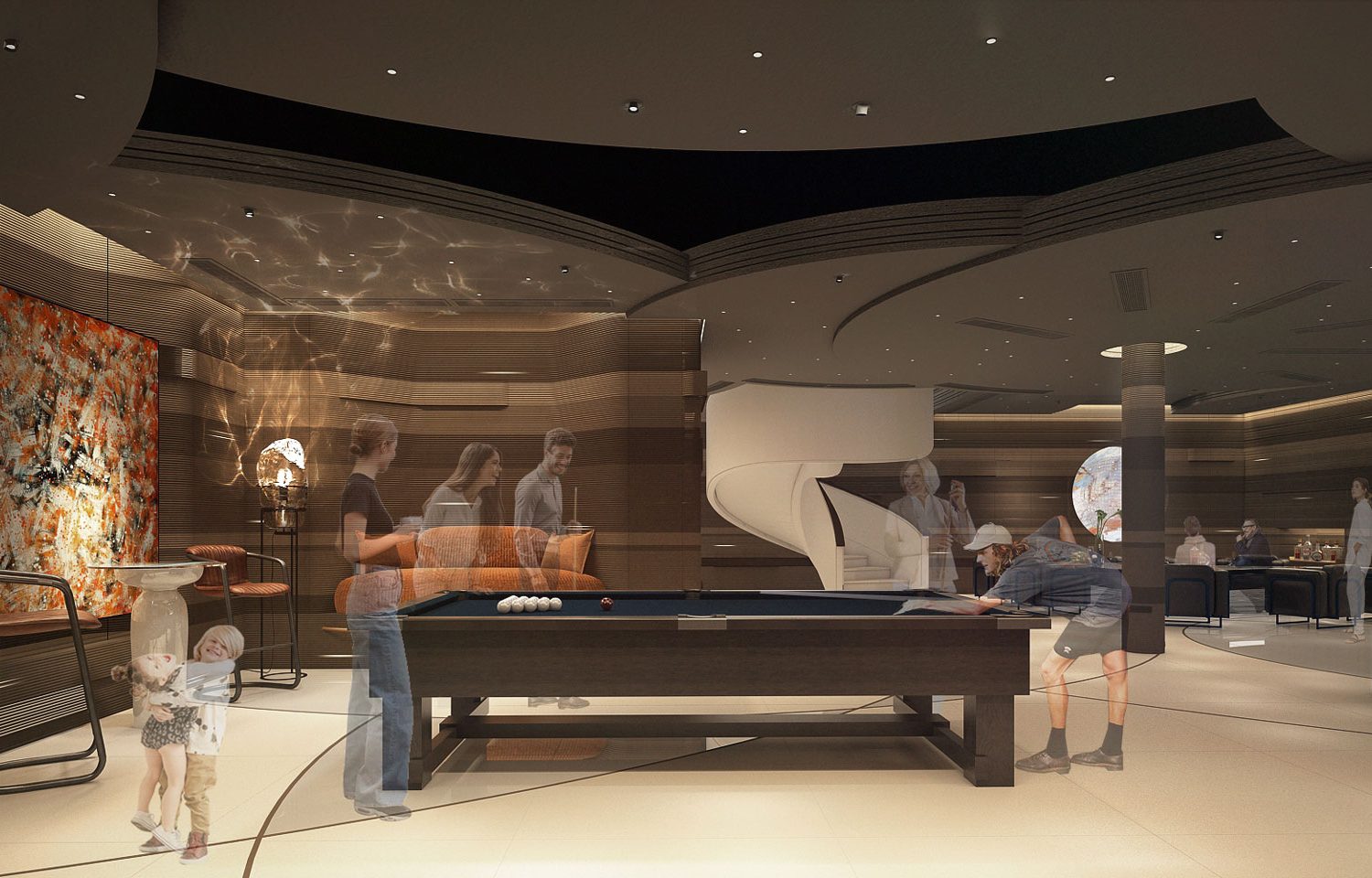 We drew inspiration from the mineral deposits in the seabed to design this space. Each layer of the wall features distinct colors, resulting in soft and textured surfaces. The interplay of soft surfaces and dynamic lighting produces subtle and elegant lighting effects.