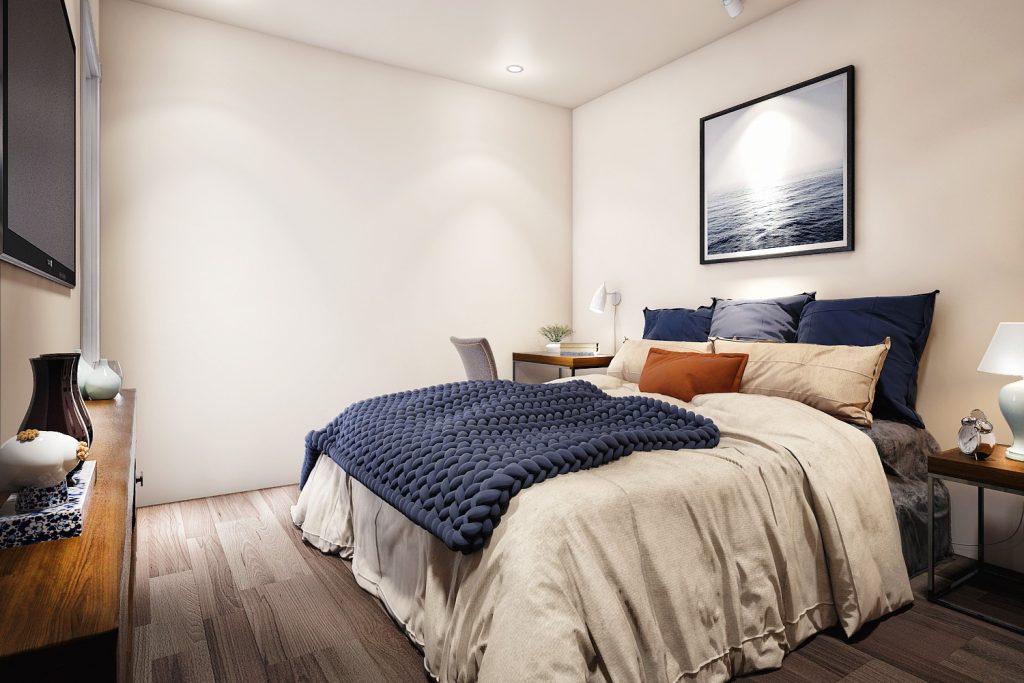 The living room has a set of gray L-shaped couch that is accentuated by the warm, elegant white color of the ceiling – wall -floor.