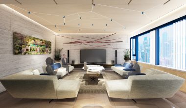 At the same time, choose evocative features to bring into a modern open space. The arrangement of the golden fishing rods in the center is like a sculpture. It symbolizes abundance. Besides, it reflects the temperament of a gentleman. Therefore this is an option with a coherent functional plan with a modern design language that is not outdated. At the same time, honoring common and private heritage values. The office location has an open view that is convenient for getting natural light.