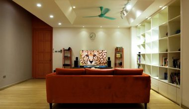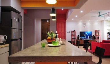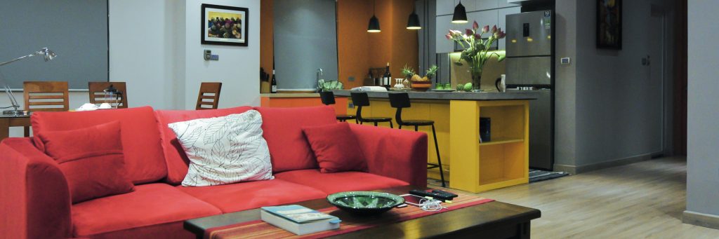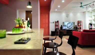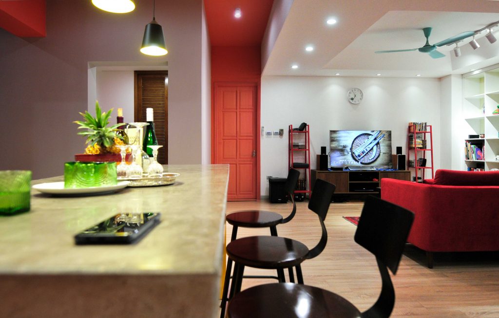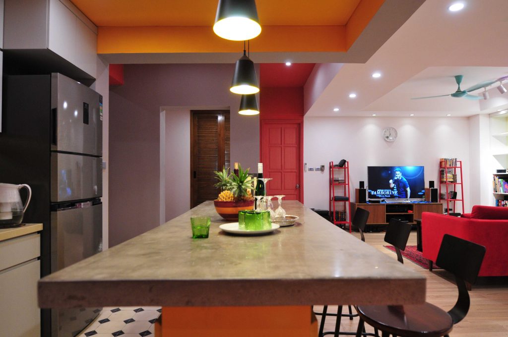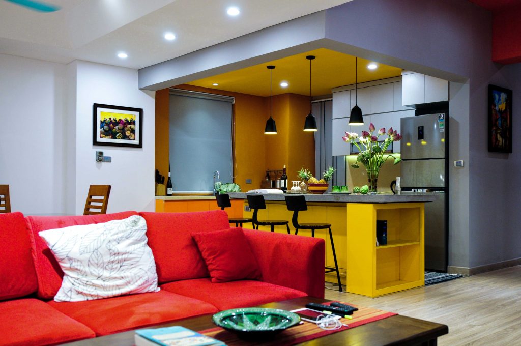 Không gian phòng ngủ là màu đỏ trầm tích. Màu vàng cho không gian bếp. Trần thạch cao được sử dụng cho phòng ngủ chính và không gian liên thông khách – ăn – bếp. Phòng bếp vô cùng nổi bật trên màu đỏ của ghế sofa và màu vàng của khu vực bếp. Tạo ra một khu vực nhà bếp với hệ thống cửa trượt linh hoạt. Tổng không gian cho bữa tối gia đình, hạn chế tối đa sự ngăn cản cố định trong không gian này.