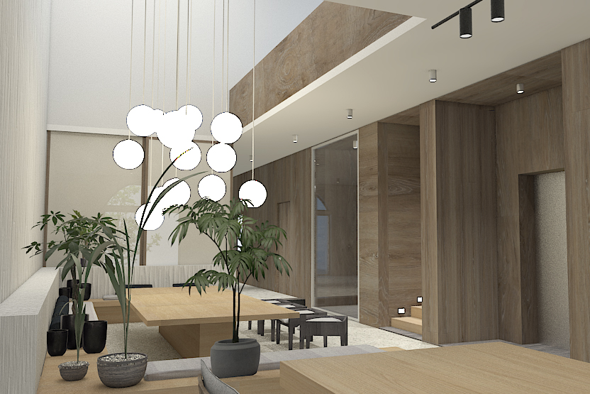 Nó được thiết kế bao gồm hai phần: Phần thấp, tối dành riêng cho việc thưởng thức rượu và cinema gia đình. Phần cao, sáng dành cho bàn billiard và bàn đá bóng mini. Hai không gian tương phản cực điểm này được đặt tiếp giáp nhau mang lại cho tầng hầm sự kịch tính, sang trọng mà không nặng nề mang lại cảm giác thú vị thực sự xảy ra khi bạn bước qua lằn ranh giới giữa cao và thấp, sáng và tối, trắng và đen, dương và âm. Buổi tối, đèn từ không gian tầng cũng sẽ góp phần chiếu sáng trang trí cho đáy bể bơi. Hai bức tranh trừu tượng của họa sĩ – frogman Phạm Kiên cực kỳ phù hợp với không gian đầy nam tính này, khiến người xem không thể rời mắt.