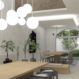 Nó được thiết kế bao gồm hai phần: Phần thấp, tối dành riêng cho việc thưởng thức rượu và cinema gia đình. Phần cao, sáng dành cho bàn billiard và bàn đá bóng mini. Hai không gian tương phản cực điểm này được đặt tiếp giáp nhau mang lại cho tầng hầm sự kịch tính, sang trọng mà không nặng nề mang lại cảm giác thú vị thực sự xảy ra khi bạn bước qua lằn ranh giới giữa cao và thấp, sáng và tối, trắng và đen, dương và âm. Buổi tối, đèn từ không gian tầng cũng sẽ góp phần chiếu sáng trang trí cho đáy bể bơi. Hai bức tranh trừu tượng của họa sĩ – frogman Phạm Kiên cực kỳ phù hợp với không gian đầy nam tính này, khiến người xem không thể rời mắt.